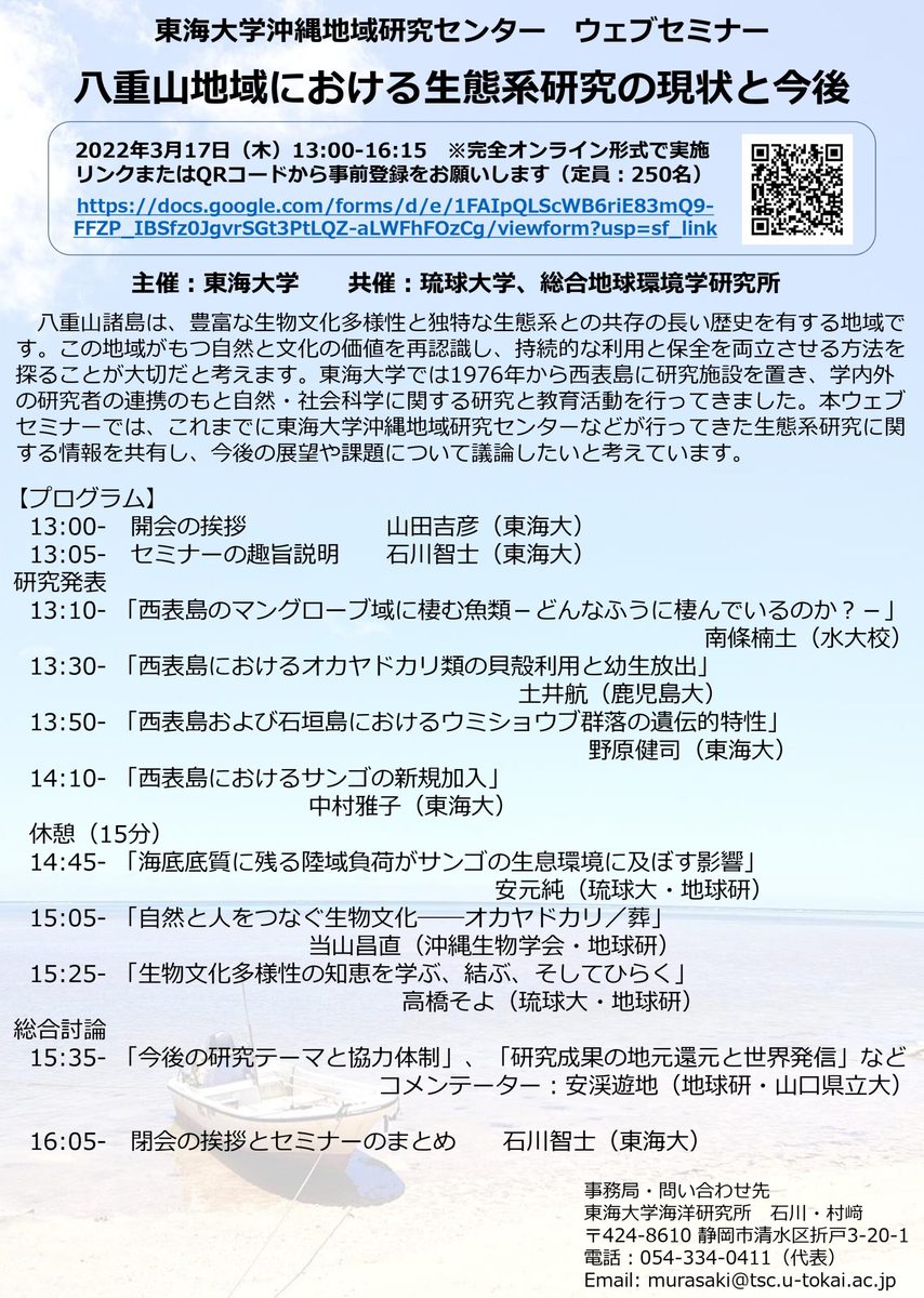 東海大学沖縄地域研究センターでは、以下のとおりウェブセミナーを開催いたします。興味のある方は、ぜひご参加ください。