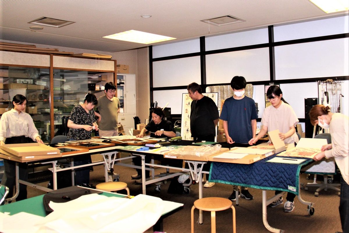 実践教育プログラムでは、同博物館の吉井大門学芸員らの指導を受け、作品を直接取り扱い、状態点検調書の作成や保存処置に関する初歩的なメンテナンスを学びました。学生たちはまず、箱に収められた資料を丁寧に取り出し、寸法や保存状態を確認しながら作品の「カルテ」を作成。和紙に刷られた鮮やかな型染カレンダーを担当した学生は、1枚1枚慎重に手に取って作品が揃っているか、他の資料が混ざっていないかなどを検証していきました。また、数時間にわたり吉井学芸員らから作品の取り扱い方などの指導を受けた学生は、額装された『団扇絵』の古い補強テープを剥がして作品に影響しない新しいテープに付け替えるといった作業に挑戦しました。