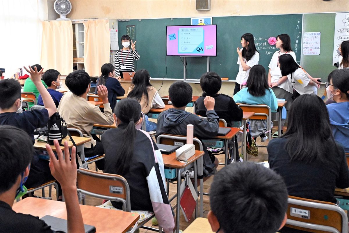湘南キャンパスで学ぶ留学生が6月12日に、キャンパス近隣の秦野市立大根小学校を訪問し、「異文化理解講座」を開きました。秦野市教育委員会からの依頼で実施したものです。本学では、学生交換協定を結ぶ海外の大学などから多数の交換留学生を受け入れており、1年(または半年)の間で日本語を学ぶ留学生向け研修プログラム「日本語教育特別講座」を開講。今回は、特別講座のうち「上級日本語」の授業を履修する韓国、台湾、ドイツ、トルコ、ロシアなどにルーツを持つ留学生ら約10名が参加し、小学6年生の児童70名と交流しました。