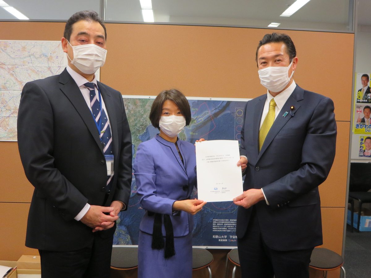 手交写真:右から黄川田仁志衆議院議員・内閣府副大臣、脇田和美教授・日本海洋政策学会側共同委員長、居駒知樹教授(日本大学)・日本沿岸域学会側共同委員長