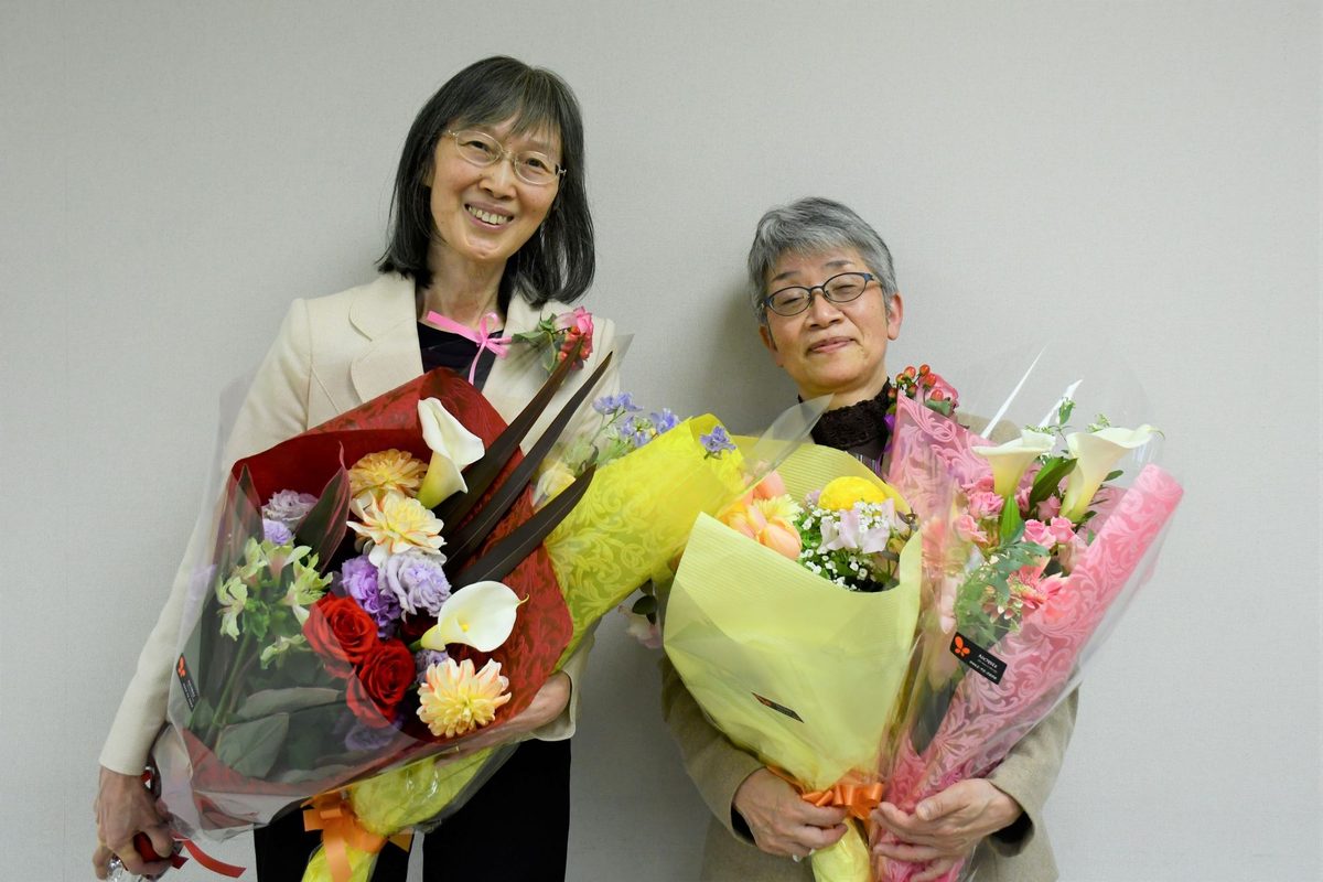 最後に、医療技術短期大学の沓澤智子学長(元・健康科学部長)と、2020年度に退任した横山寛子教授、基礎看護学領域の森屋宏美准教授が両教授との思い出を振り返るとともに感謝の言葉を送り、同領域の教員が看護学科を代表して花束と記念品を贈呈しました。