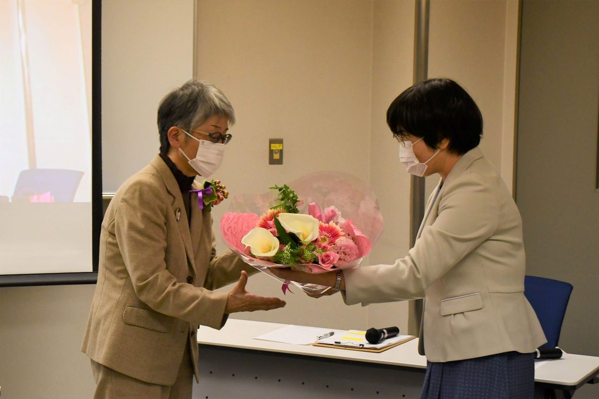 最後に、医療技術短期大学の沓澤智子学長(元・健康科学部長)と、2020年度に退任した横山寛子教授、基礎看護学領域の森屋宏美准教授が両教授との思い出を振り返るとともに感謝の言葉を送り、同領域の教員が看護学科を代表して花束と記念品を贈呈しました。