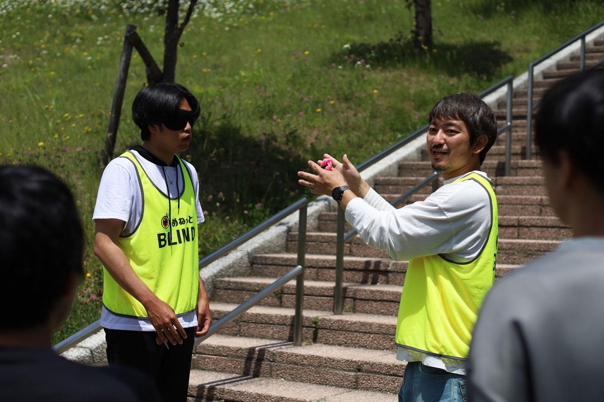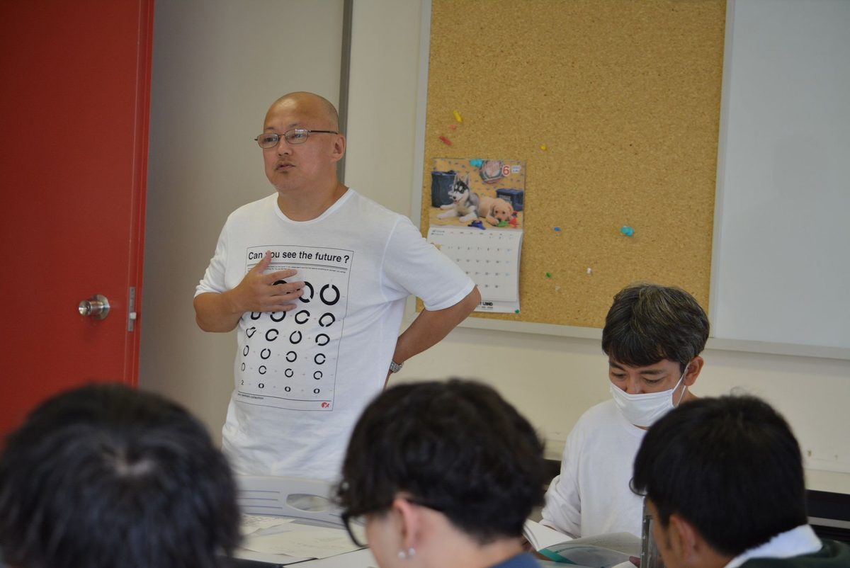 本授業では6月30日と7月7日、14日に、視覚に障がいのある一般の方をお招きして普段の生活を送る上での困りごとやこれまでの楽しかった体験などについて講話を聞ききました。また、7月2日と23日には観戦会場となるエスコンフィールドHOKKAIDOを視察し、試合がある日とない日の現地の様子を確認しています。視覚障がい者の方による講話では、北広島市を拠点に活動する視覚障がい者団体「めねっと北広島」(2019年設立)の会員である杉本勝久さんと大場日出男さんらが講演。視覚障がいの概要をはじめ、先天全盲や中途弱視(視野狭窄と低視力)の障がいがある人たちが普段どのように暮らしているか、非日常的な場所での活動の際にどのようなサポートが必要になるかといった内容についてお話をうかがいました。学生たちは、「視覚障がいについて、知っているようで知らなかったことを知ることができました。例えば、横断歩道で鳴っている誘導音は東西と南北で音が違うということや、駅の改札口付近でも改札や階段の位置を知らせるため音があることを知りました。今回学んだことを8/23の東海大学DAYでも活かしていきたいです」と感想を語っていました。