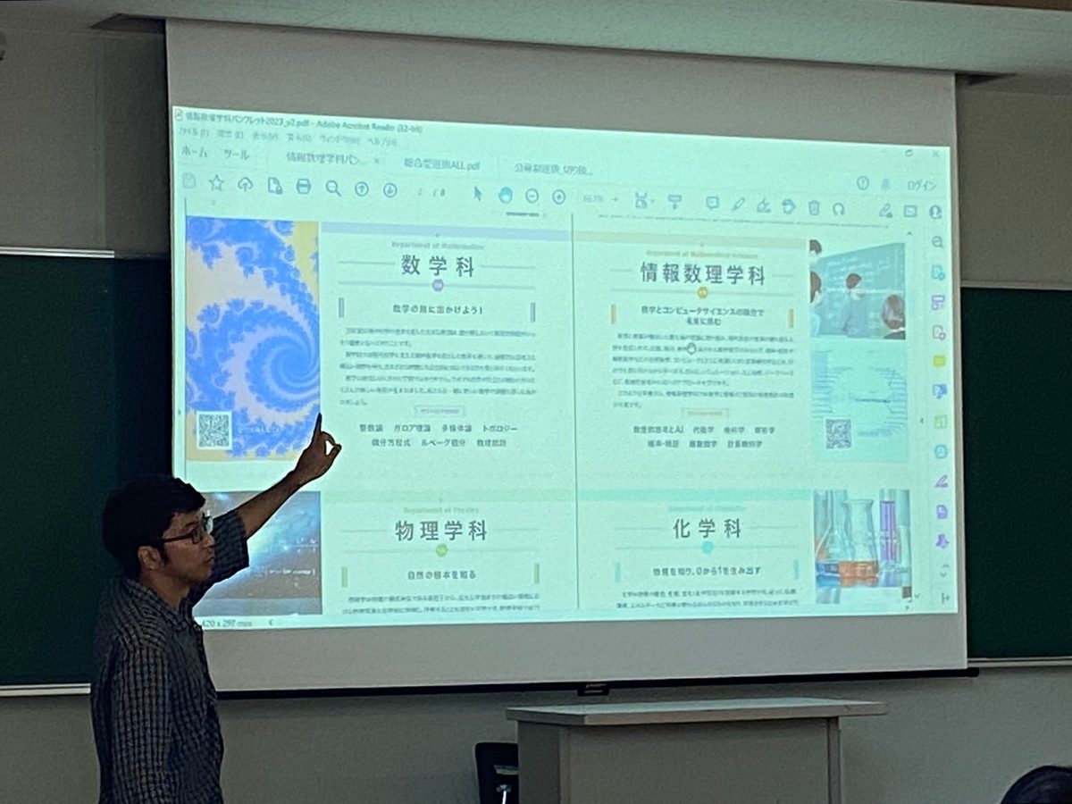 情報数理学科は、8/5(土)は「データサイエンス」の、8/6(日)は「教職」の話題に関する講演をしました。5日は40名強,6日は30名強の参加者があり、熱心に耳を傾けて下さいました。ご来場のかたがた誠にありがとうございました。