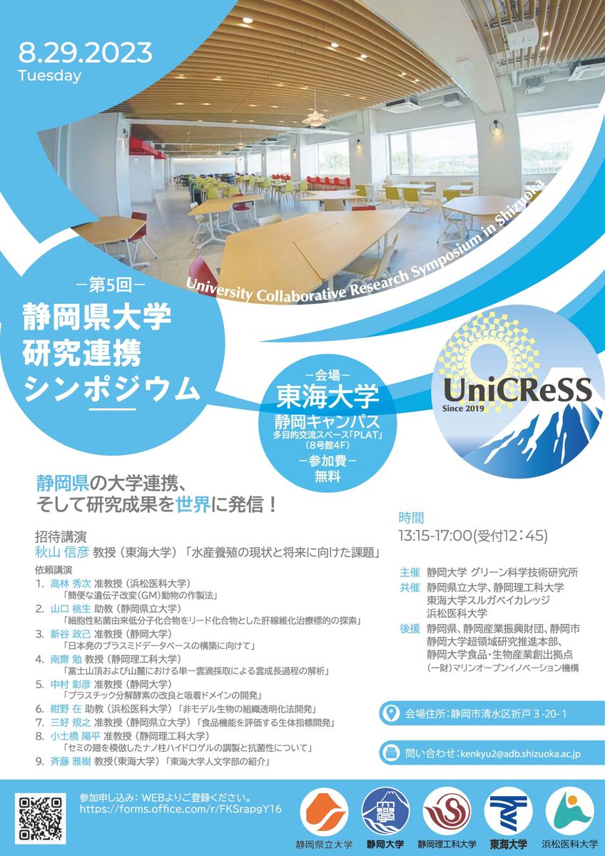 静岡大学グリーン科学技術研究所主催による「第5回静岡県大学研究連携シンポジウム」が静岡キャンパスで開催されます。