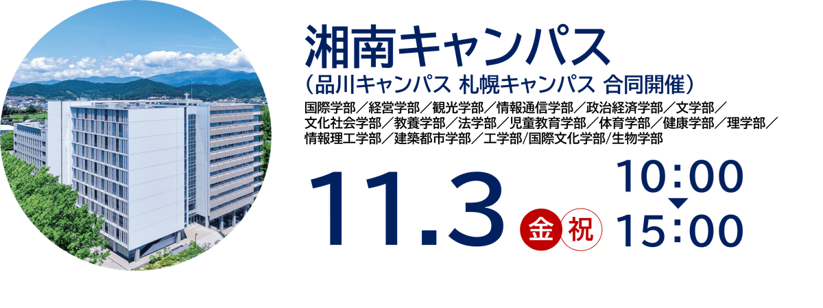人文・社会学系から理工系、さらにスポーツ系まで、バリエーションに富んだ学部・学科が集結した湘南キャンパス。