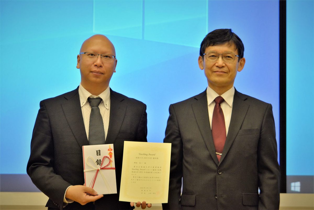 生物学部海洋生物科学科の野坂裕一講師が「2021年度ティーチング・アワード」の優秀賞に選ばれ、4月1日に札幌校舎で網野真一札幌キャンパス長(学長補佐)から賞状と目録が手渡されました。本学では教育の質向上を目指し、2002年度から優れた授業を行う教員らを「ティーチング・アワード」として顕彰しています。1年間の授業を対象とした学生による授業アンケートなどの結果に基づき、ユニバーシティビューローを中心とした厳正な審査を経て学長により決定されるもので、2021年度は4名に優秀賞を授与しました。