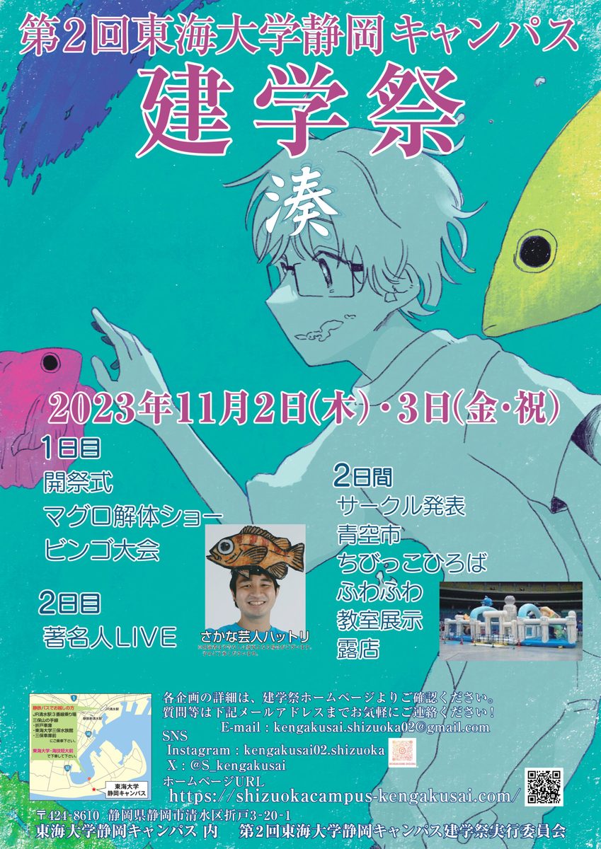 今年度の静岡キャンパス建学祭のテーマは「湊(そう)」です。“みなと”とも読めることから、駿河湾を望む、海につながりの深い静岡キャンパスの特色を生かそうと考えられました。多くの人が集まる港のように、海洋学部と人文学部の垣根を超えてコミュニケーションを図りたい、たくさんの種類の魚が生息する駿河湾と同様に、全国各地からさまざまな学生が集まるこのキャンパスらしい建学祭にしたいという思いが込められています。見どころは、2日(木)に行われる「マグロの解体ショー」で、コロナ禍以前から続いている海に関わりの深い静岡キャンパスならではの伝統ある企画です。