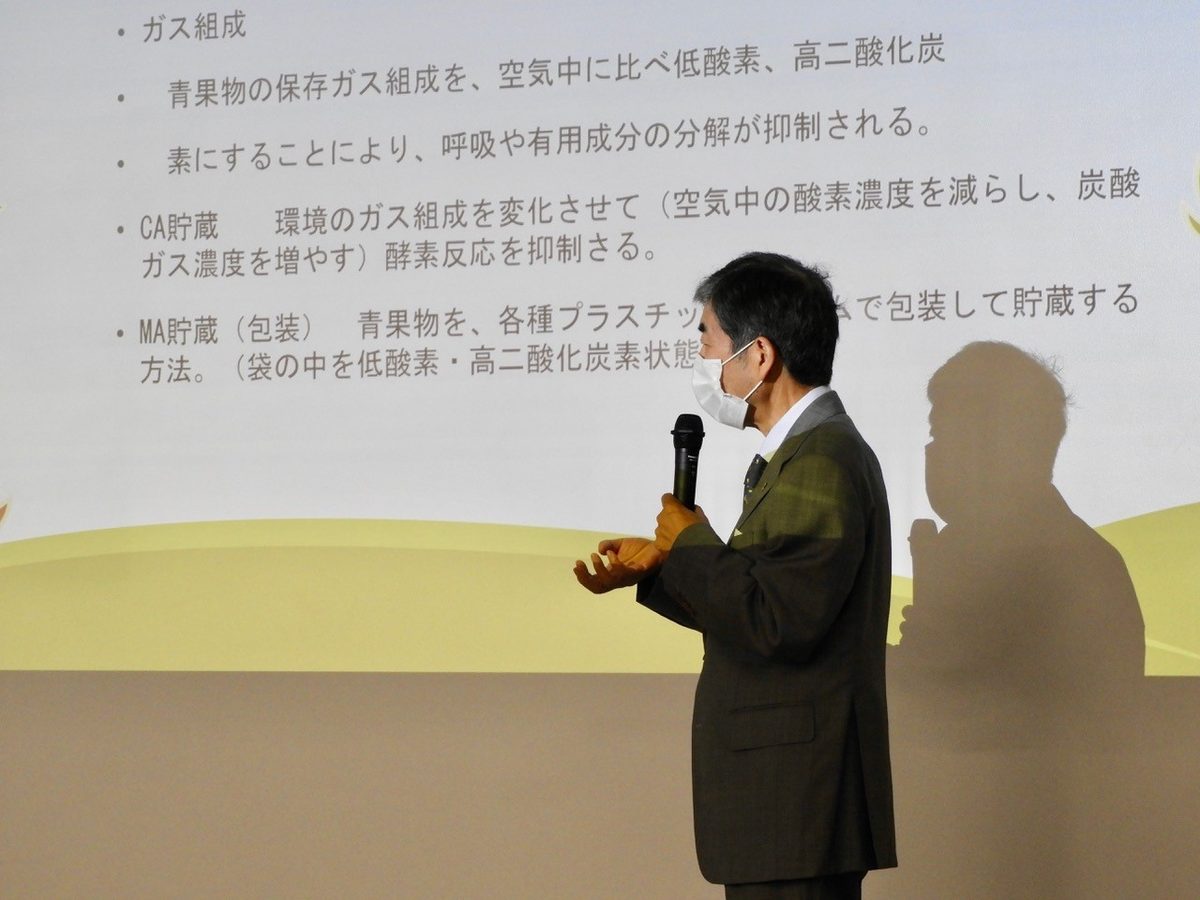 本学農学部はこの協議会の正会員校であり、同資格教育を提供する養成校として認定されています。今年度は、筒井知巳先生(東京聖栄大学健康栄養学部名誉教授、食品科学教育協議会会長)が講師として招かれ、「食品加工に見られる日本人の知恵」について研修講義を行いました。この研修会には応用植物科学科(現:農学科)、応用動物科学科(現:動物科学科)、バイオサイエンス学科(現:食生命科学科)の4年次の学生が参加し、日本人の食生活と食品加工の歴史、納豆や味噌、漬物、清酒などの発酵・醸造食品、発酵時の機能性成分とその変化に関する幅広い知識を深めました。