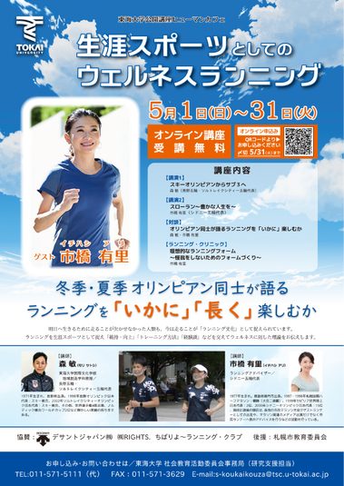 札幌キャンパスでは5月1日(日)から31日(火)まで、東海大学公開講座ヒューマンカフェ「生涯スポーツとしてのウェルネスランニング」をオンラインで配信します。講師はランニングアドバイザーでシドニー五輪代表の市橋有里さんと98年長野・02年ソルトレイクシティ五輪日本代表で本学国際文化学部地域創造学科の森敏教授。講座では夏季・冬季オリンピアン同士による「ランニングをいかに長く楽しむか」をテーマにした対談や市橋さんによる「理想的なランニングフォーム~怪我をしないためのフォームづくり~」をテーマとしたランニング・クリニックを展開します。市橋さんは「走ることで人は変わるし、変われる。生涯スポーツであるランニングを通じて充実した生活を送ってほしい」と語っております。視聴には事前のお申込みが必要となります。ぜひご覧ください。