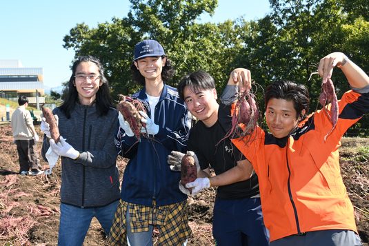 その後は、来場者が畑に入り、農学部農学科の2年次生が「農学実習」で育てた3種類のサツマイモ(高系14号、紅あずま、紅はるか)やダイコン、ニンジン、サトイモを収穫。「困っていることはありませんか?」「どちらからいらっしゃったんですか?」と学生たちが声をかけ、交流を図る姿も見られました。熊本市内から参加した親子連れは、「土に触る機会はなかなかないので、食育にもつながる体験ができてありがたい」と話し、農学部生とともに訪れた保護者は、「息子がどんなところで学んでいるのか知る貴重な経験になりました」と笑顔を見せていました。石本さんは、「阿蘇キャンパスの建学祭で収穫祭を行っていたと職員さんに聞き、その復刻版として臨空で行えれば、地域の方々にもキャンパスを見てもらえるいい機会になるのではと考えました。こんなにも多くの方に来場いただき、驚いています」とコメント。福留さんは、「阿蘇の収穫祭に行ったことがあるという人も来てくださり、“また来年!”と声をかけてもらえてうれしい。キャンパス周辺は農家さんも多いので、今後の連携につなげていければ」と話していました。