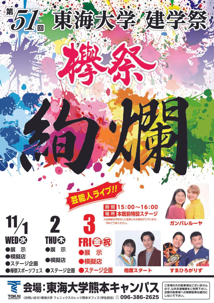 建学祭欅祭をより煌(きら)びやかにという意味を込め、テーマに【絢爛(けんらん)】を掲げました。全ての来場者に東海大学熊本キャンパス、阿蘇くまもと臨空キャンパスの教育・研究や各種活動の内容を深く知ってもらうと同時に、学生一人ひとりが輝けるものを作ります。