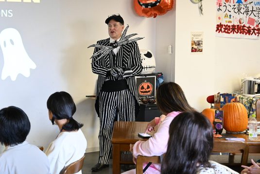 運営補助として司会を務めた二川翔太さん(国際文化学部国際コミュニケーション学科3年次生)と安達真優さん(同2年次生)は、「参加者の皆さんとの英語でコミュニケーションでは、普段学科で学んできた成果を生かせたと思います。これまでハロウィンに関連するイベントに参加した経験がなく、仮装も初めてだったので私たちも楽しい時間を過ごすことができました」と充実した表情を見せていました。