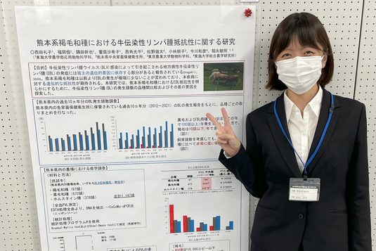18日の大会では、ポスター発表が実施され、農学部の学生も3組が参加。個別質疑応答などを経て西田礼子さん(4年次生)らによる「熊本系褐毛和種における牛伝染性リンパ腫抵抗性に関する研究」が特別賞選考対象演題の口頭発表に進み、優秀賞を受賞しました。西田さんは、「学部生のうちに学会発表を経験したいという思いで、所属する稲永先生の研究室で取り組んできた研究テーマであり、これからまとめていく自分の卒業研究にも関わる内容で発表に臨みました。口頭発表は緊張しましたが、他の研究者の方たちのお話を伺う機会になり、卒業研究への意欲が高まりました」と話していました。