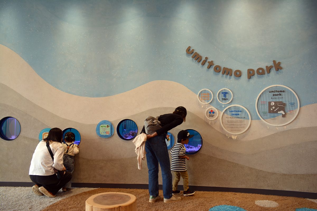幅広い世代が楽しめる空間「umitomo park」は子ども目線の高さに水槽が設置されており、魚や生き物を観察しながら「海とともに生きる」、「海の豊かさを守る」ことの大切さを体感できる交流スペースです。学生たちが展示内容を考案した水槽は「Umitomo scope(ウミトモスコープ)」と名付けられ、「清水のさかな」「沖縄のさかな」「共生するいきもの」「水をきれいにしよう」の4つのテーマに分かれており、本キャンパスの水族応用生態研究会が制作・監修と飼育を担当。コンセプトの立案をはじめ水質浄化に向けたコーヒー炭のサンプル制作や展示内容の解説は、海洋学部海洋文明学科3年次生の山崎歌鈴さん、人文学部人文学科2年次生の青野実莉さんら有志の学生が担当しました。