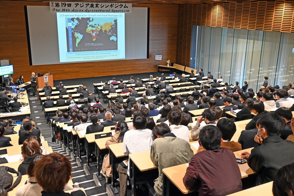 阿蘇くまもと臨空キャンパスで12月2日に、第19回アジア農業シンポジウム(主催・東海大学)を開催しました。この催しは、アジア諸国における食料・農業問題を考えていくために、研究成果を共有と研究者間の交流を深めることを目的として1982年から開催している国際会議です。農学部が主体となりアジア諸国の大学・研究機関と連携し、日本、フィリピン、タイ、シンガポールなどアジア各地で各国の農業と環境問題を中心に討議を進めてきました。19回目となる今回は2018年以来5年ぶりの実施であり、今年4月にオープンした阿蘇くまもと臨空キャンパスでは初の開催となりました。「今考える農学の未来~農学は、地域、世界、未来とどう向き合うべきか?~」をテーマに、口頭発表とポスター発表、パネルディスカッションなどを実施。学生や教職員、熊本県内の高校生や住民らが来場したほか、オンライン配信も併用したハイフレックス方式を採用し、全体で約600名が参加しました。