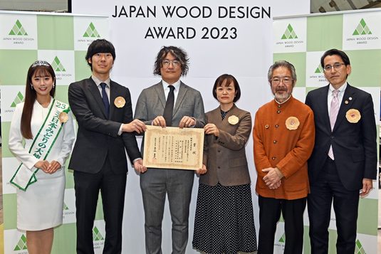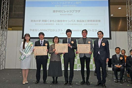 阿蘇くまもと臨空キャンパスの食品加工教育実習棟がこのほど、一般社団法人ウッドデザイン協会が主催する「ウッドデザイン賞2023」ソーシャルデザイン部門の優秀賞(林野庁長官賞)を受賞。12月6日に東京ビッグサイトで表彰式が開かれ、東海大学職員の小須田絹代さん(学長室施設設備担当)らが林野庁の青山豊久長官から表彰状を受け取りました。同賞は、優れた建築・空間や製品等を顕彰して木のよさや価値をデザインの力で再構築することが目的。9回目となる今回は3部門に335点の応募があり、計31点が表彰されました。