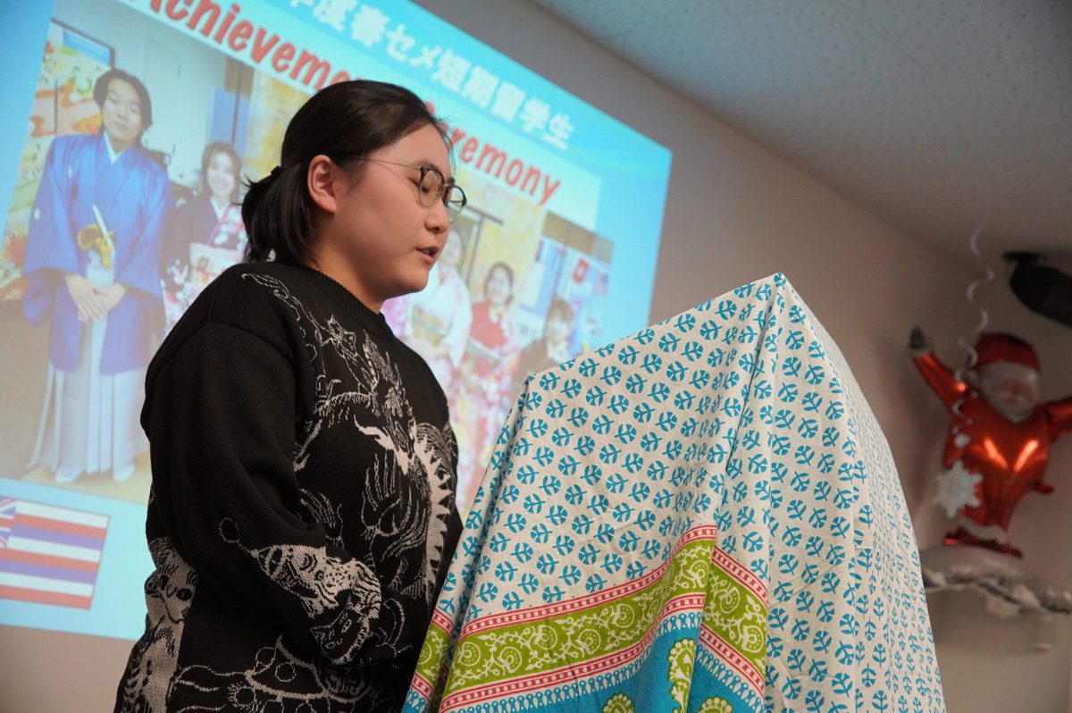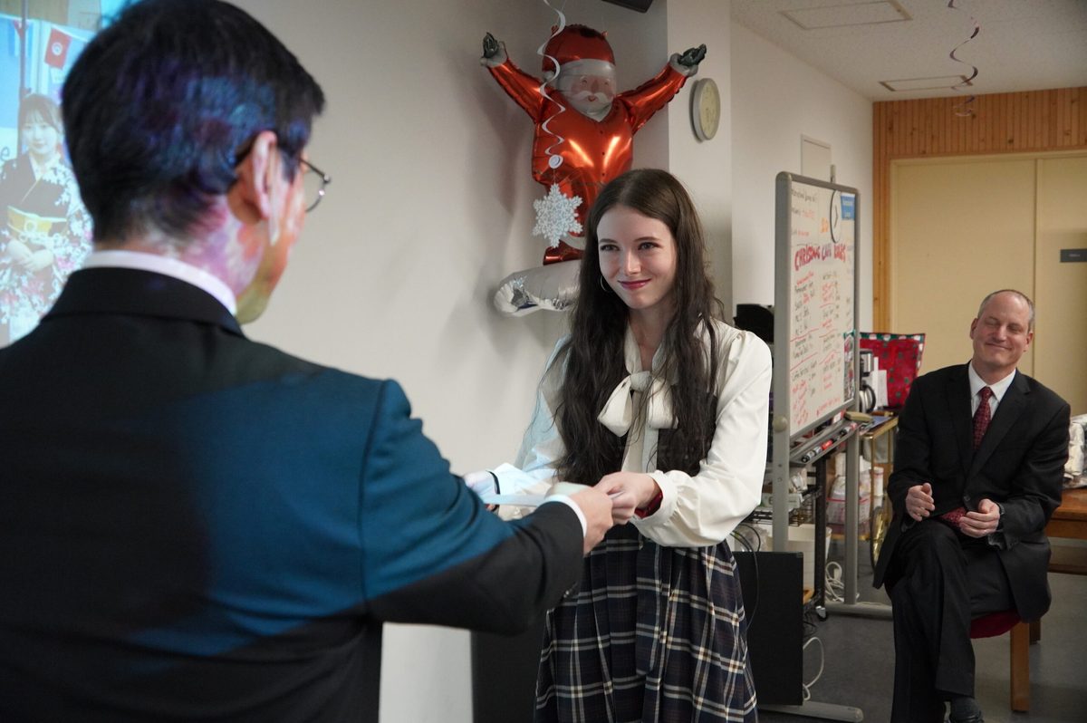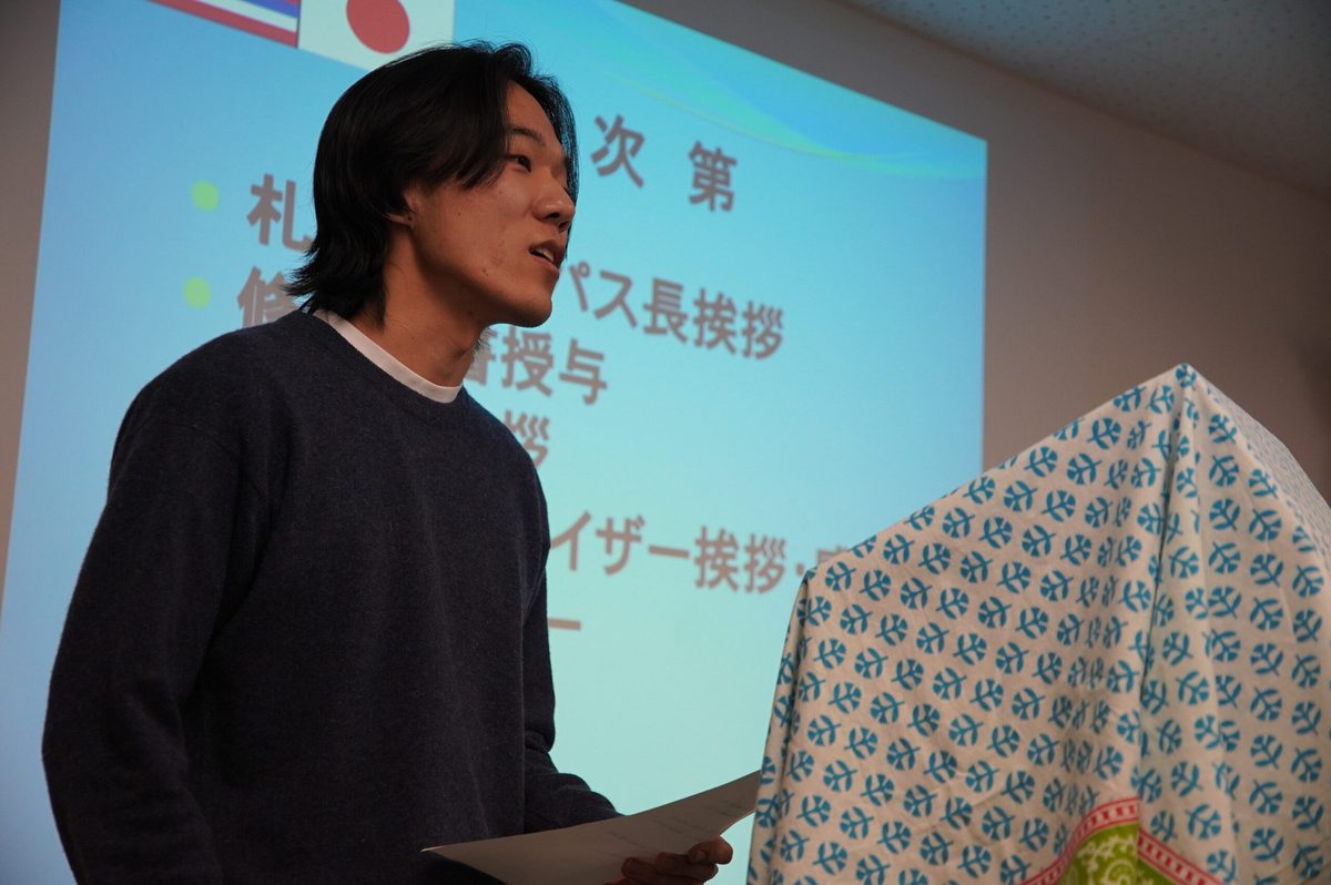 12月15日に国際交流会館2階インターナショナルラウンジで行われた修了式には札幌キャンパス教職員・学部生ら約70名が参加。修了式では、網野キャンパス長から留学生に修了証書が授与された後、ハワイからの留学生が日本語で留学生活の思い出やお世話になった在学生、教職員への感謝の言葉などを述べました。暖かく、感謝のこもった メッセージに出席した留学生・教職員・学生から大きな拍手が送られ、心に残る 1日となりました。