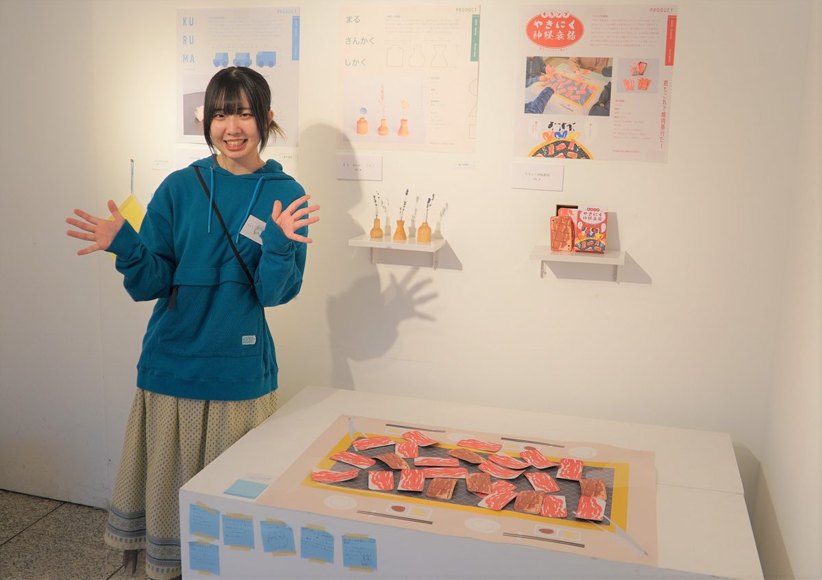 「学科の授業『プロダクトデザインA』で食における幸せを考えるという課題がありました。この授業が大好きで、授業終了後も食に関するデザインに挑戦したいと思い、制作してみました。卒業まであと1年ほどですが、卒業研究作品についても今回の展示会同様、楽しみながら、遊び心があるデザインに挑戦したいです」