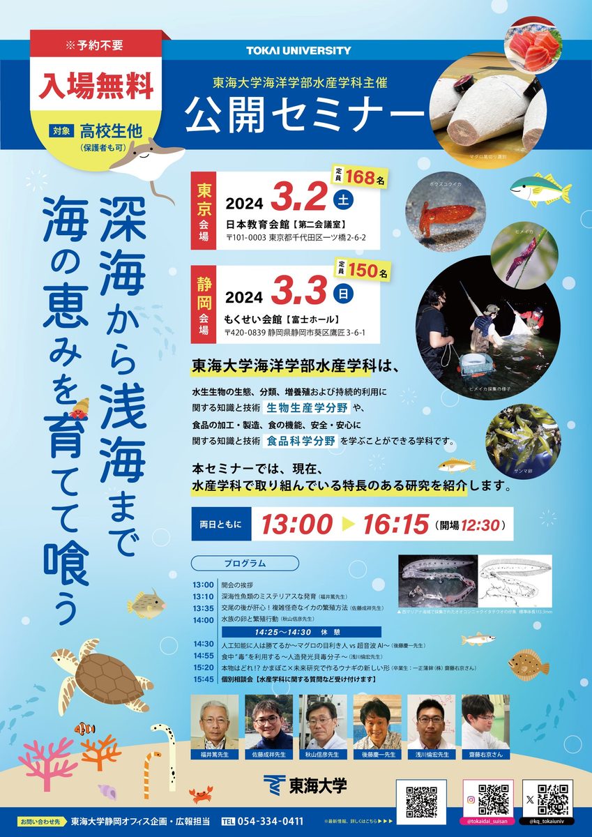 海洋学部水産学科では2024年3月2日(土)、3日(日)に公開セミナーを開催します。