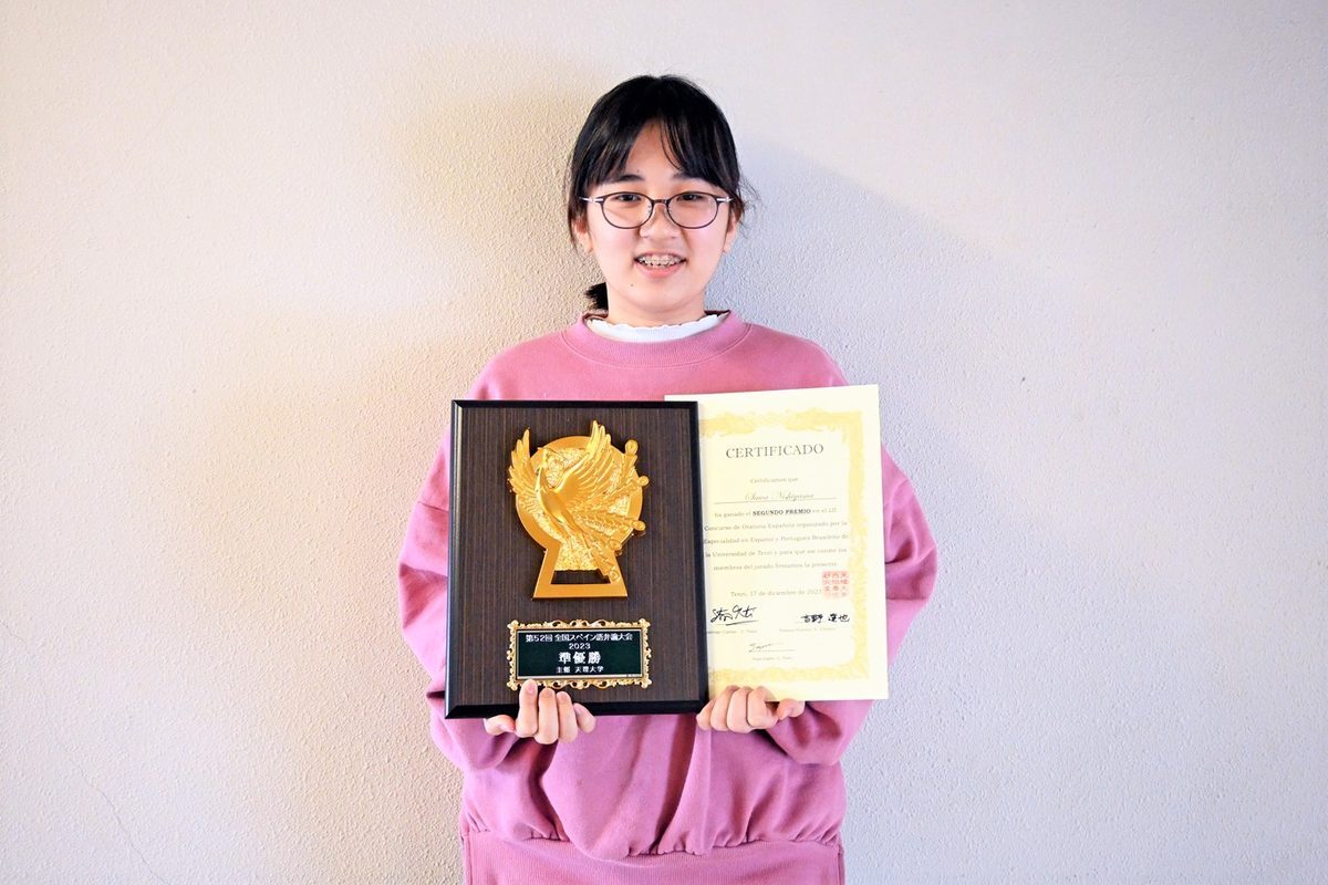 観光学部観光学科1年次生の西山紗和さんが、12月17日に天理大学杣之内キャンパスで行われた「全国スペイン語弁論大会」で準優勝しました。天理大学が主催する本大会は、語学教育や社会問題、自身の経験などさまざまなテーマについてスペイン語で発表するもので、全国から11名の学生が参加しました。