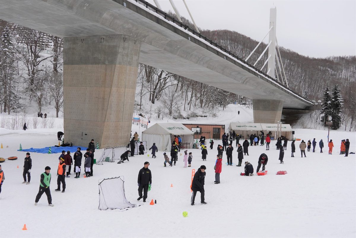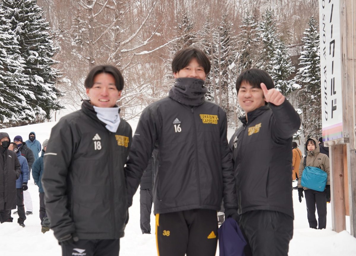 札幌キャンパスのサッカー部が1月21日に、札幌市南区・国営滝野すずらん丘陵公園で開催された「ウィンターマラソン2024 in 滝野すずらん丘陵公園」で、サブイベントの運営を担いました。この大会は、同実行委員会の主催で、株式会社スポーツショップ古内や札幌陸上競技協会などが協力、同公園内の特設コースを会場に雪上を駆け抜けるイベントです。サッカー部では、競技とともに地域貢献活動も充実させようと2020年から同イベントの運営に協力しています。