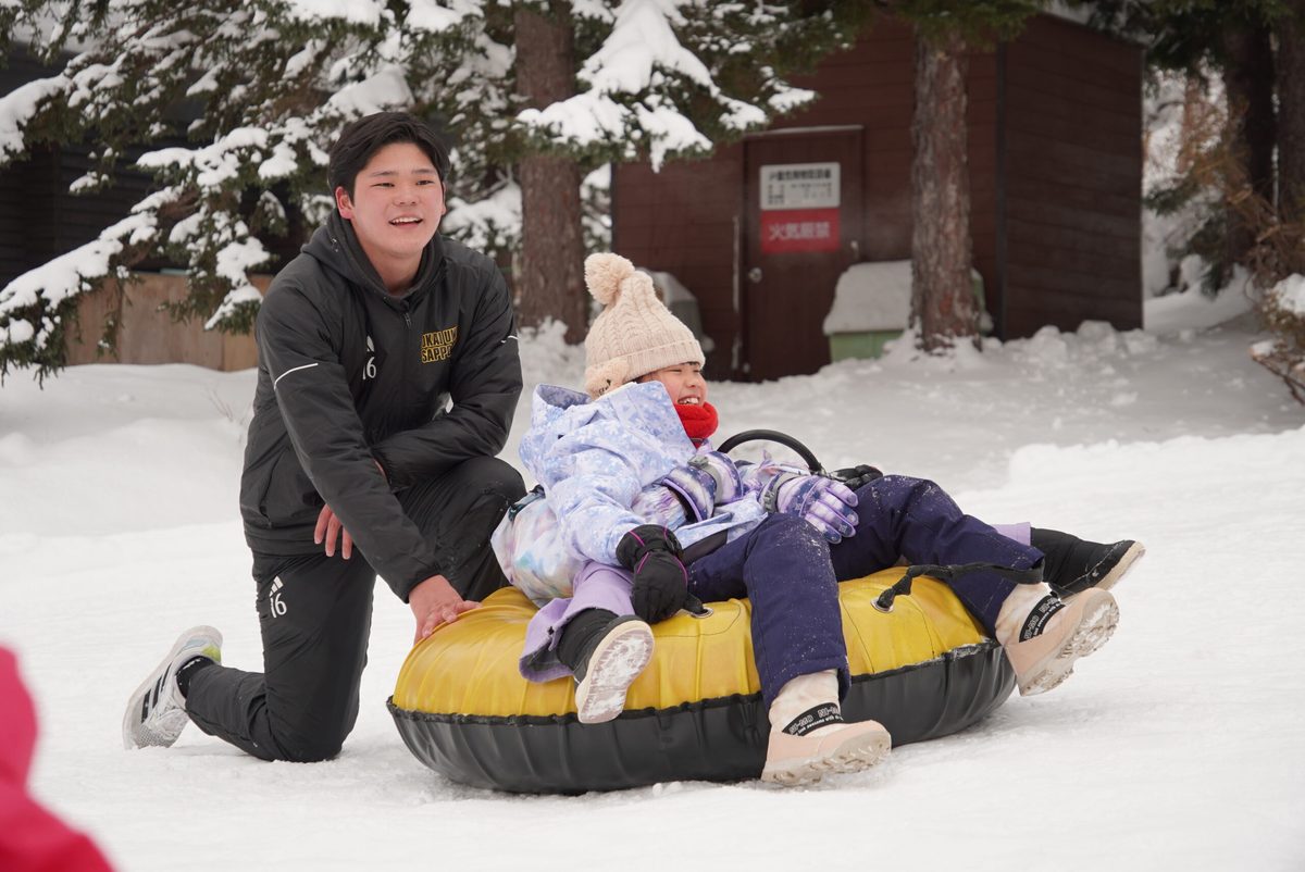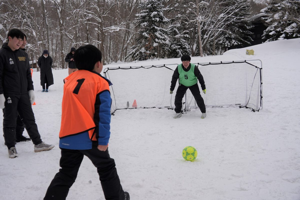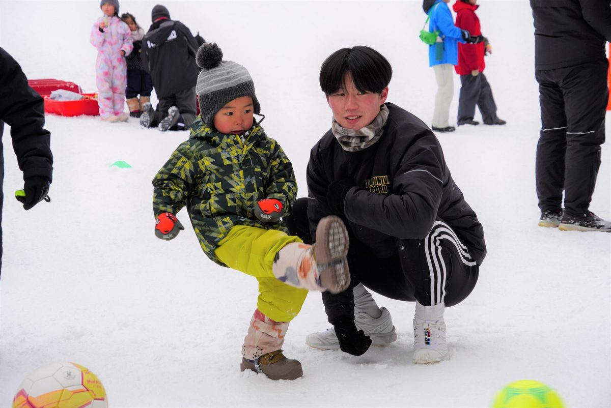 当日は、マラソン参加者の伴走を担当した他、スタート前後の時間に小学生らが遊べるようにと「雪中サッカー」「PK対決」「雪上チューブ滑り」を実施。多くの子どもたちがサッカー部の学生たちと楽しい時間をすごしました。
