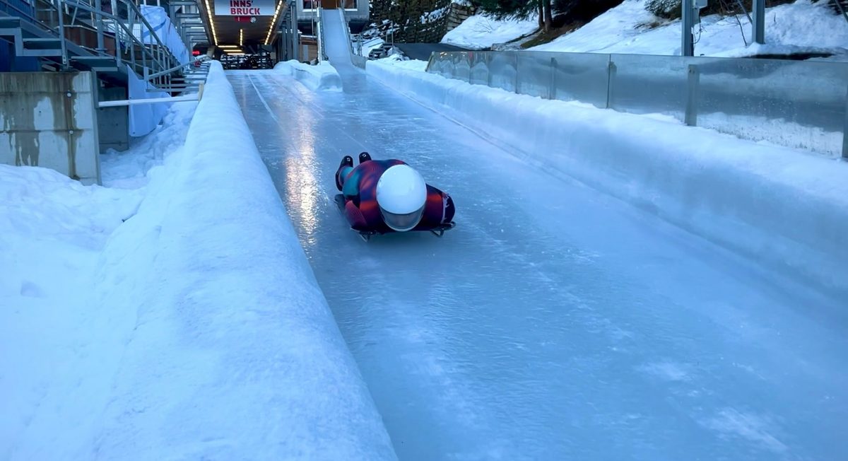 札幌キャンパス硬式野球部の川野隼選手(国際文化学部国際コミュニケーション学科4年次生)が鉄製のソリにうつ伏せで乗り氷上を滑走する「スケルトン」競技に挑戦しています