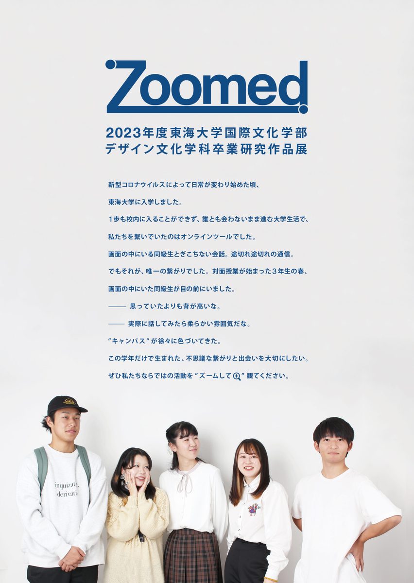 本作品展は、卒業を控えた同学科の4年次生が、1年をかけて取り組んだ卒業研究作品を、多くの皆さまにご覧いただこうと企画したものです。現4年次生は新型コロナウイルスによって日常が変わり始めた頃、本学に入学しました。混乱の中、学生らを繋いでいたのはオンラインツールでした。タイトルの「Zoomed」には、オンラインならではの環境下で培われた技術・知識をもとに制作した作品をズームして観ていただきたいという想いが込められております。