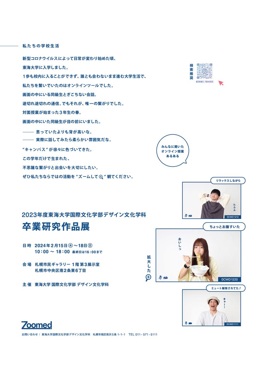 東海大学[札幌キャンパス]国際文化学部デザイン文化学科では、2月15日(木)から18日(日)までの期間、札幌市民ギャラリーにおいて「Zoomed 2023年度 卒業研究作品展」を開催いたします。