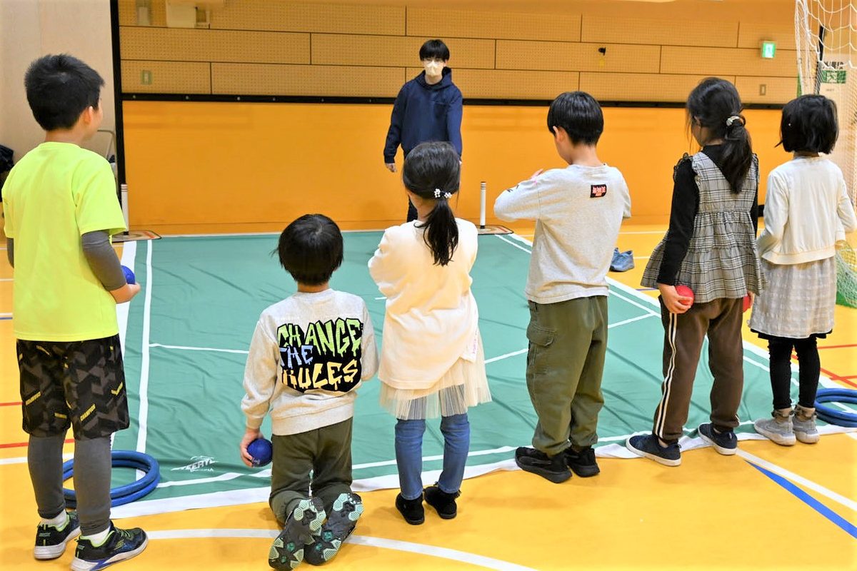 最初に北濱准教授が、「今日は皆が見たことのないものをたくさん持ってきました。自分でやってみるのが一番ですから、ぜひいろいろなもので遊んでください」と呼びかけ、学生とデモンストレーションをしてそれぞれの種目の遊び方を説明。子どもたちは各々、バスケットピンポン、ボックスホッケー、アトラックゲーム、ボッチャなど8種目のニュースポーツを順番に遊びながら自分の気に入った種目に熱心に取り組み、中でもボッチャは大人気で会場には子どもたちの歓声が響きました。
