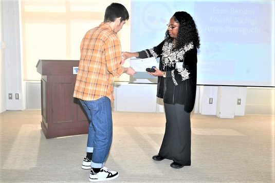 今年度は、湘南、熊本、札幌キャンパスから1463名が挑戦。1年間で40冊以上(ベーシックレベル)、または15万語以上のGRを読了した学生51名を表彰しました。表彰式には約10名が出席し、読了した冊数や語彙量に応じて上位から「ダイヤモンド」「ルビー」「エメラルド」「ゴールド」「シルバー」「ブロンズ」の各入賞者にGR委員会のメロディ・エリオット教授が表彰状とオリジナル記念バッジを手渡しました。