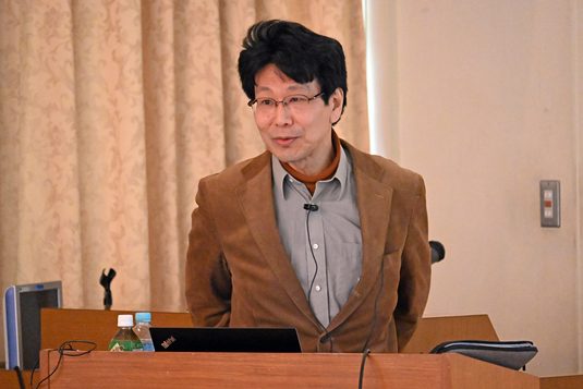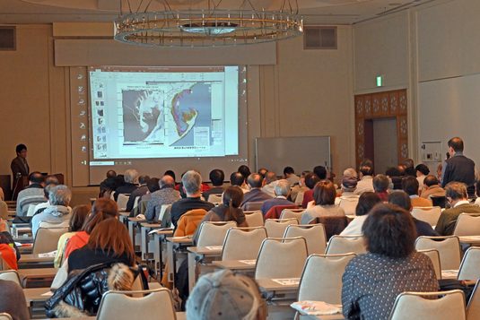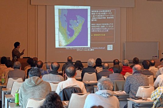 海洋学部海洋地球科学科の原田靖講師が2月24日に、静岡市東部勤労者福祉センター清水テルサで開かれた「防災セミナー」で講演しました。固体地球物理学、プレート運動論が専門で、グローバルプレート運動論や一億年スケールの地球の自転軸の運動の解析、GPSによる地殻変動データ解析の研究に取り組む原田講師は、「南海トラフ巨大地震のひっ迫度と静岡市周辺の津波シミュレーション」をテーマに講演。市民ら約100名が聴講しました。