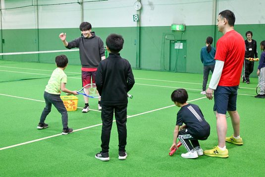 品川キャンパスに近い東京・品川プリンスホテル内の高輪テニスセンターで2月24日に、同キャンパスで活動する硬式テニス部の学生2名と卒業生4名が「高輪子ども中高生プラザ(TAP)」との連携イベント「テニス教室」を実施しました。大学の施設や知的・人的資源を活用し、地域交流や多世代間交流を推進する本学とTAPとの連携事業「たかなわ子どもコミュニティカレッジ」の一環として開いたものです。