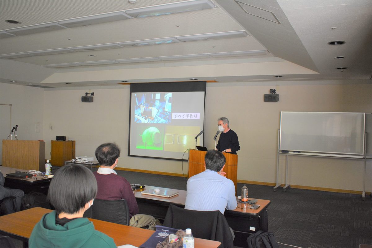 最後に村山司教授がイルカの知能について、これまでの研究活動とその成果について講演しました。実際に水族館で行われた実験の様子の映像を用いて解説し、イルカの自己認知には個体差があることや、なぜイルカは人の行動を真似することができるかなどについて話しました。