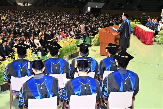 式では各学部の総代と各賞受賞者に松前義昭学長が学位記や表彰状を手渡し、総長賞の受賞者には髙野二郎副総長が表彰状を、学部長らが記念品を授与しました。式辞では松前学長が学園の創立者・松前重義が掲げた『若き日に』から始まる4つの言葉に触れ、「『若き日に』は一生における青春を示唆している言葉です。『思想を培え』『体躯を養え』『知能を磨け』は青春を保つための手段であり、人生をよりよくする指針でもあります。『希望を星につなげ』は、“人生における青春をいつまでも続けよ”と創立者が皆さんに残した言葉であり、本学で学んだ皆さんにはこれからの人生を前向きな姿勢で歩んでいただきたいという願いが込められています」と語りました。さらに、職場で幅広くコミュニケーションを取る重要性や、仕事を積極的に引き受けて経験と実績を積む大切さを語り、「一時的な成功や目標の達成は一瞬で過ぎ去ります。過去は取り戻すことができません。後悔のない人生を送るためにも、しっかりとした人生観を持って日々を過ごしてください」と語りかけました。