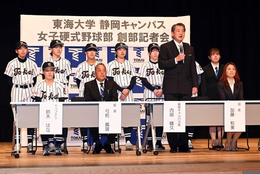 会見には1期生8名と、静岡翔洋高女子野球部の監督と兼任する弓桁義雄監督(静岡翔洋高中等部教諭)らが登壇。初めに内田晴久静岡キャンパス長が、「全国の女子硬式野球の盛り上がりを静岡キャンパスで具現化することで、課外活動や地域の活性化につなげていければと考えています。温かいご支援をお願いします」とあいさつしました。続いて弓桁監督が、「静岡翔洋高の女子野球部ができた4年前は、高校の女子野球部は全国で32校でしたが現在では64校に増え、女子野球人口も急激に増えています。高校生の進路先の環境を整えるとともに、自分たちが先頭を切って女子野球を盛り上げていきたい」とコメント。さらに、加藤和美部長(海洋学部准教授)が選手たちを紹介し、鈴木はなキャプテン(人文学部1年次生)は、「8名と少ない人数ですが、明るく元気に活動しています。女子野球の魅力でもある笑顔を忘れずプレーして、応援されるチームをつくっていきたい。切磋琢磨し、高め合い、数多くの大会でよい成績を残していけるように日々努力していきます」と意気込みを語りました。