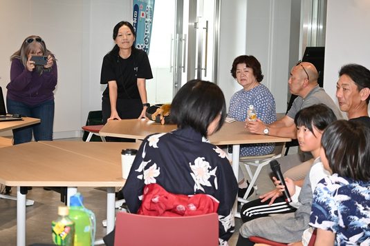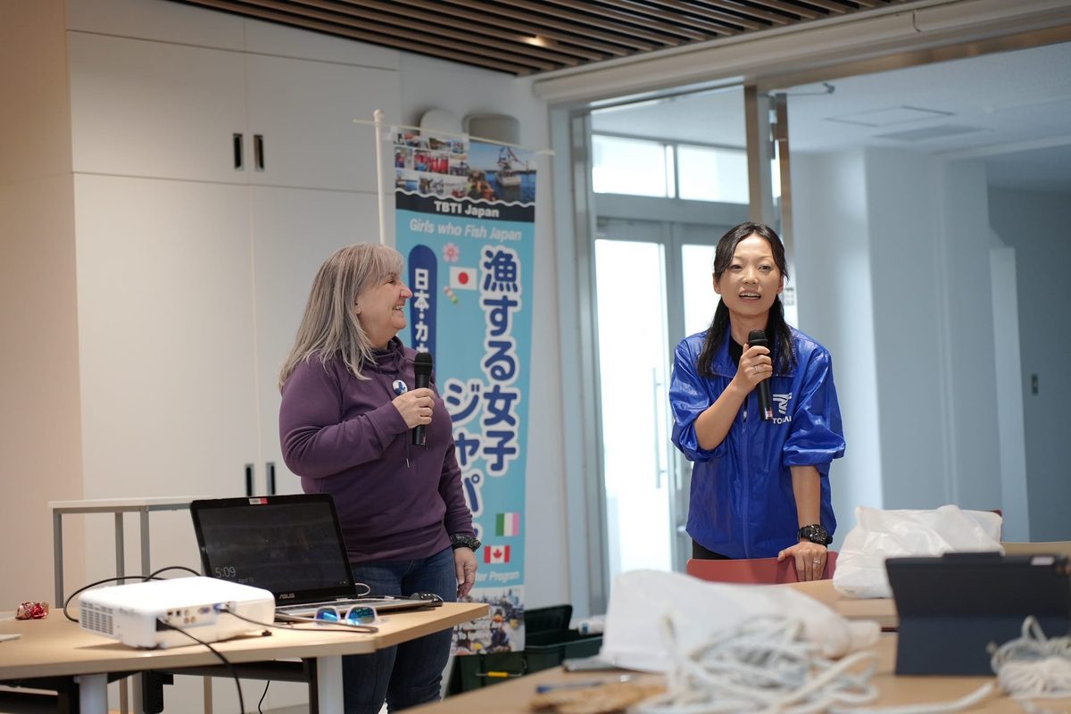 当日は、まず李准教授がプログラムの概要を説明し、「漁する女子カナダ」のコーディネーターで自身も漁業を営むキンバリー・オーレン氏が講演。カナダでの漁の様子や課題を動画で紹介しながら、日本の小規模漁業との相違点について語りました。講演中にはプログラムに協力するデザイナーのケリー・ブルートン氏も登壇し、自身が制作してきた作品について解説。「小規模漁業の現状や漁業の魅力を伝えるため、さまざまなプログラムに協力してきました。参加者とともにものづくりをする時間は、製作中は作品にかかわるテーマについて、自然と自分の考えを巡らせるため非常に有益です。今後もこのプログラムに参画し、小規模漁業を盛り上げていきたい」と語りました。