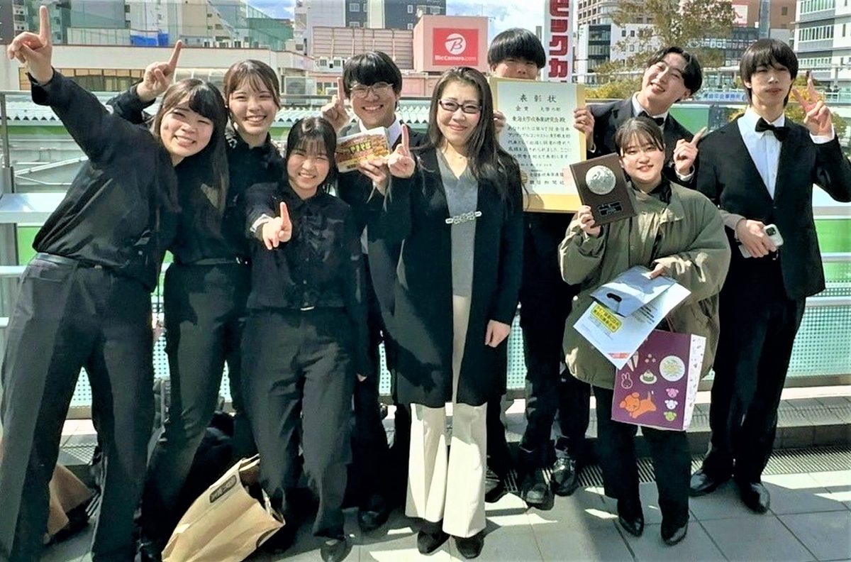 大井さんは、「8名中6名が3年次生で、1年時から同じチームを組んでアンサンブルコンテストに挑戦してきましたが、過去2回は都予選進出に留まりました。その分、今大会にかける思いも強く、本番では緊張しましたが自分たちの最大限の演奏ができました。金賞をいただけて本当にうれしい」と話しています。また、3月29日には、湘南キャンパスで部長教員の成川忠之教授(経営学部)と共に梶井龍太郎学長代理ら教職員に金賞受賞を報告。