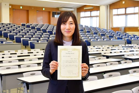 塚本准教授は、「この賞は学生によるアンケートの結果から選出されるもので、受賞は多くの学生に興味を持ってもらえたからこそであり、大変うれしく感じています。授業でも学生たちに話していることですが、私も日々学び続けています。各科目で新しいことを伝え、さらに研究活動の充実も図っていき、教育・研究両輪を積み重ねて得られた成果を授業に反映させていきたいと考えています」と今後への意欲を語りました。