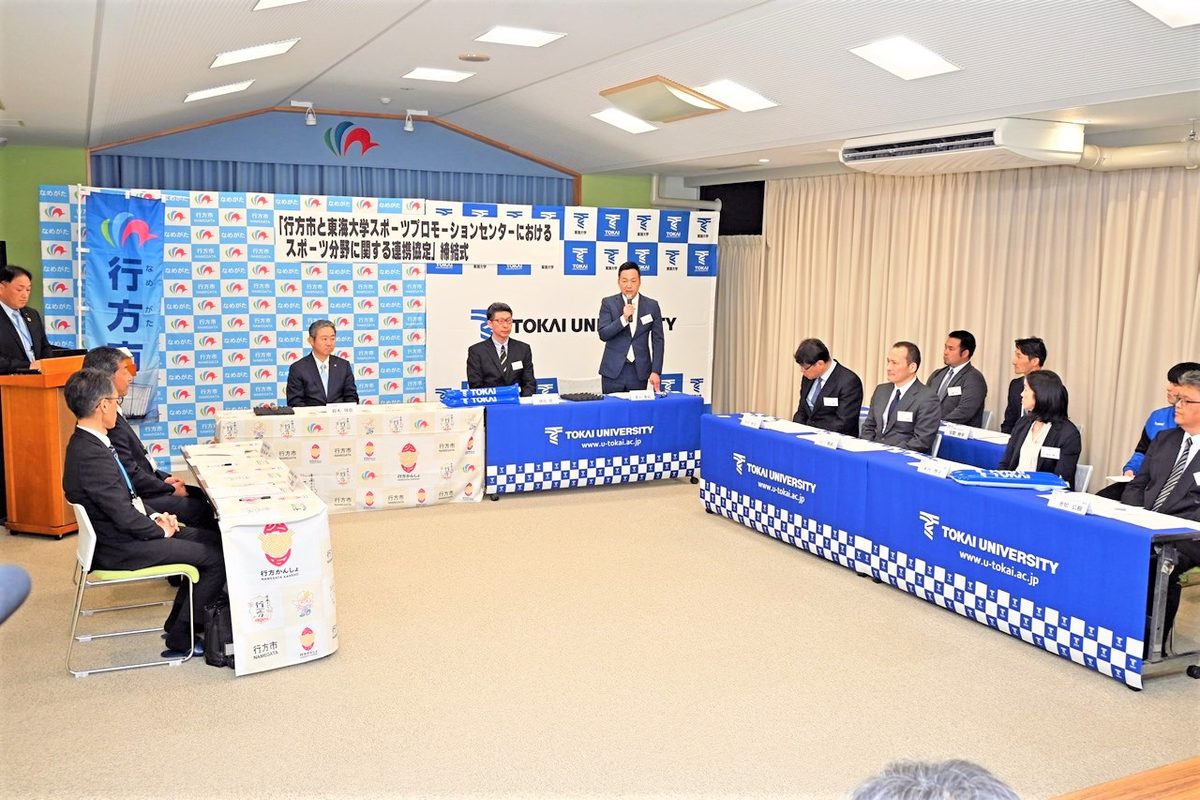 調印式当日は、行方市から鈴木市長や教育委員会の柏葉伸一郎教育長らが出席。本学からは陸川所長や山口輝義次長(本学職員)、田村修治次長(SPC教授)のほか女子ハンドボール部の栗山雅倫監督(同)と選手を含む17名が参列。まず鈴木市長があいさつに立ち、「行方市においてハンドボールは伝統ある地域スポーツの一つで、児童生徒は大学生の高い技術を間近で見られ大変刺激を受けていると思います。誰もが気軽にスポーツを楽しめる場を創設して市民同士の交流を図るなど、スポーツを通した魅力あるまちづくりに励んでまいります」と語りました。続いて陸川所長は、「本センターではスポーツによる地域貢献を行っており、行方市が目指すものと一致していると感じています。今後も力を合わせてお互いの発展に向けて進んでいきたい」とコメントし、栗山監督は、「部員と一緒に、皆さまと子どもたちが活躍できる場をつくり上げていけることをこの上ない幸せだと思っています」と話しました。また、今年は7月に交流イベントを開く予定となっており、大田歩果主将(体育学部4年次生)は、「私たちがハンドボールを通じて行方市の方々と交流し、ハンドボール界の発展向上にもつなげられたら」と抱負を語りました。