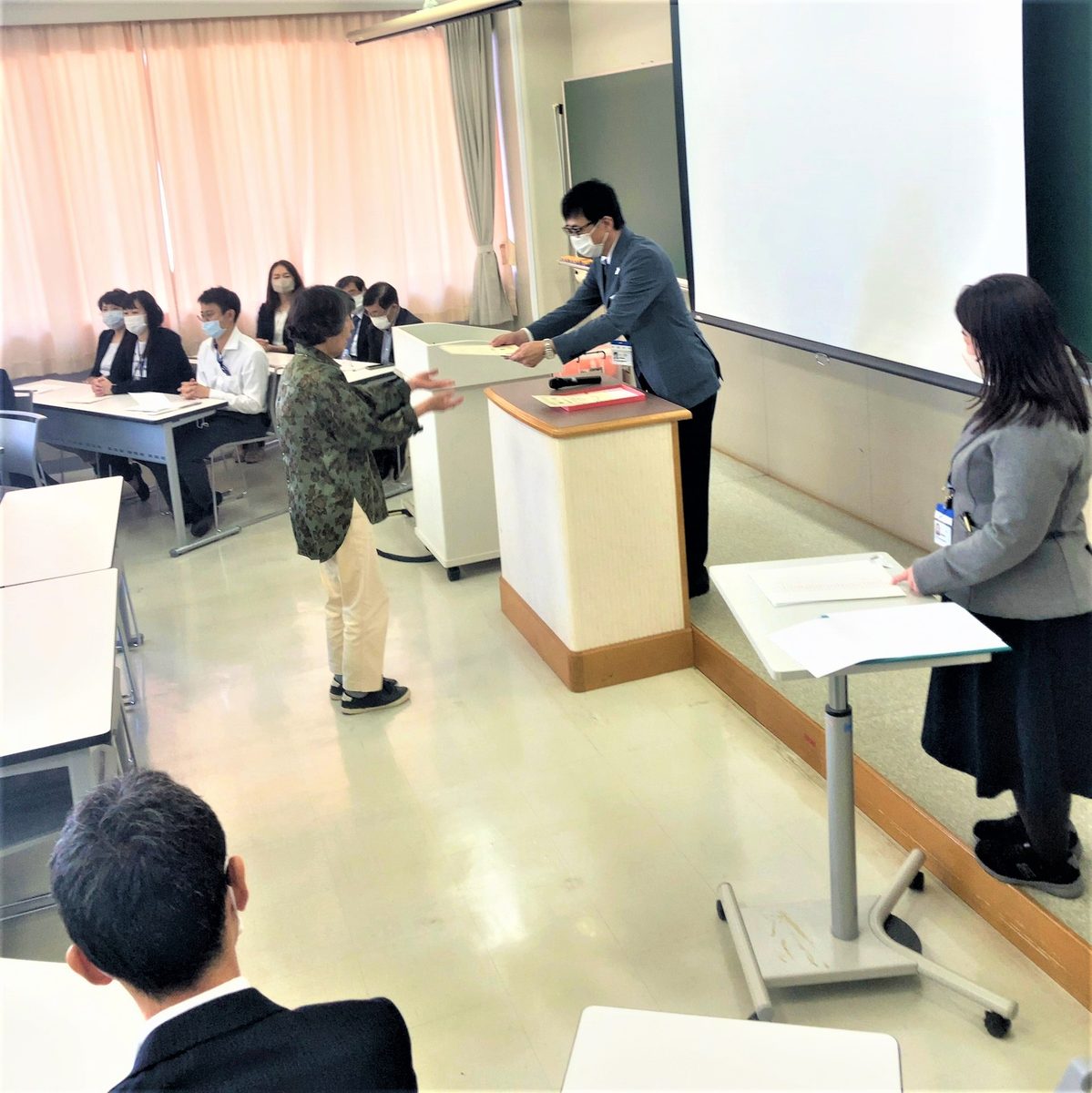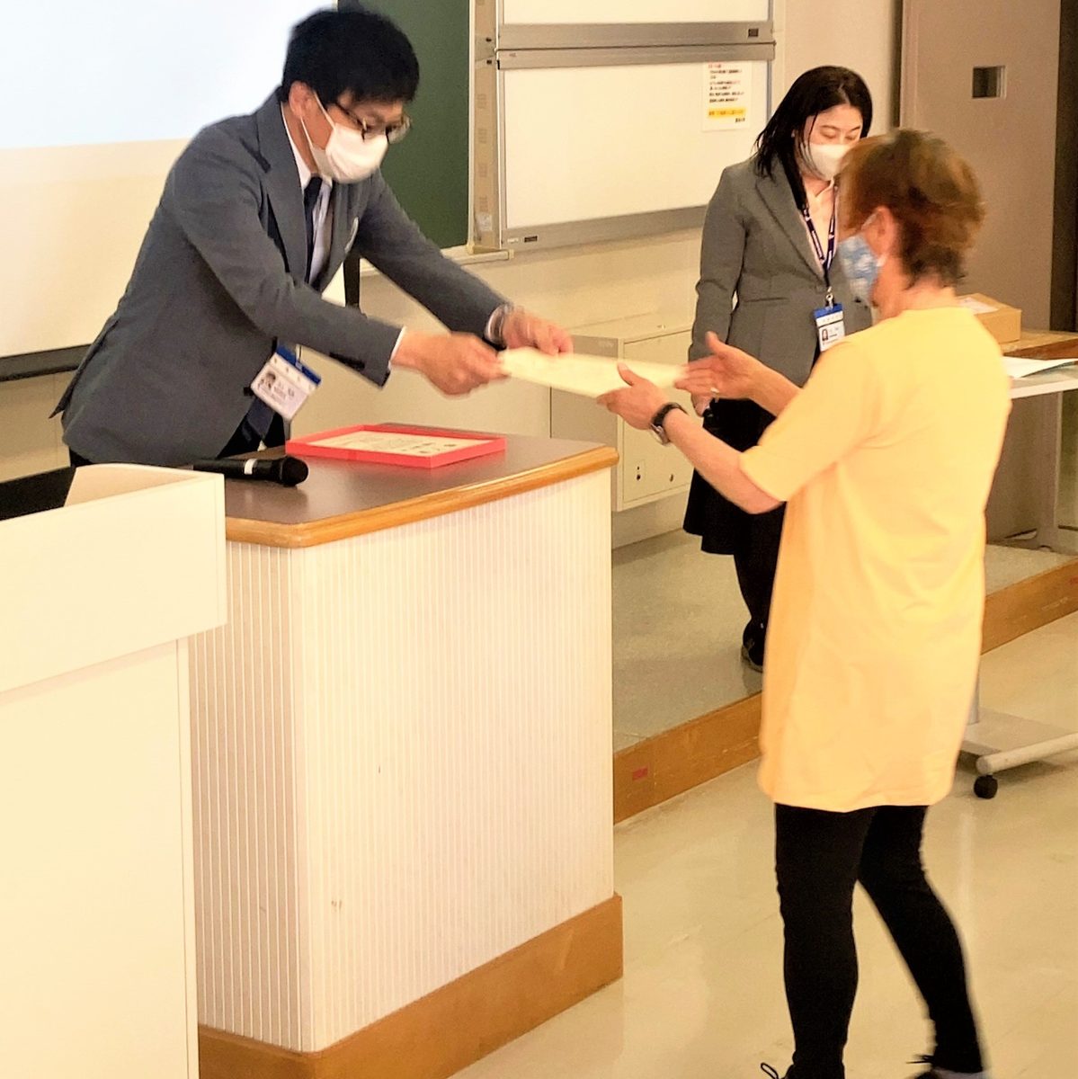 当日は閉講式の前に、講座の初回と最終回に行った健康・体力測定の数値の推移について、本事業の企画運営に開始当初から携わってきた健康クラブ相談役の谷口幸一先生と松木秀明先生(共に元東海大学教授)が総括。閉講式では、副会長を務める沓澤智子特任教授(スポーツ医科学研究所)が開式の辞を述べ、会長の吉川隆博教授(医学部副学部長)が参加者に修了証を授与しました。吉川教授は参加者に労いの言葉を送るとともに、自身が昨年58歳でバイクの免許を取得したことに触れ、「何歳になっても新しいことへのチャレンジが健康の秘けつです。1年限りではなく、ぜひ来年以降も継続して参加してください」と呼びかけました。最後に伊勢原市保健福祉部スポーツ課課長の細野徹氏があいさつし、体育学部生涯スポーツ学科の野坂俊弥教授が閉会のことばを述べました。