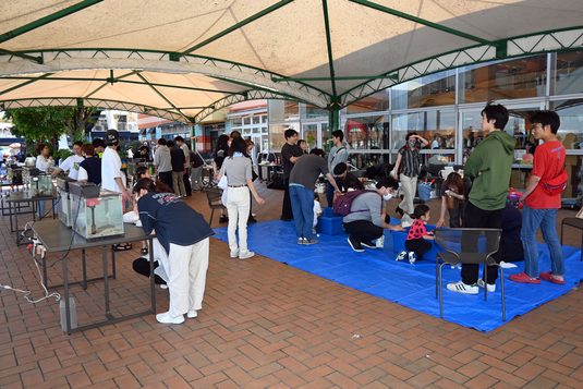静岡キャンパスの水族応用生態研究会が5月18日に、静岡県清水区のショッピングモール「エスパルスドリームプラザ」で「ミニ水族館」を開催しました。このイベントは、昨年12月から人文学部と海洋学部が同プラザ内「umitomo park」で行っている展示水槽を使った水質浄化に関する研究で、同研究会が展示制作・飼育を担当していることをきっかけにドリームプラザから依頼された企画です。駿河湾に生息する身近な魚や生き物の魅力について、地域住民に知ってもらうことを目的に開かれました。