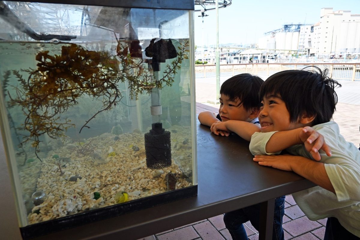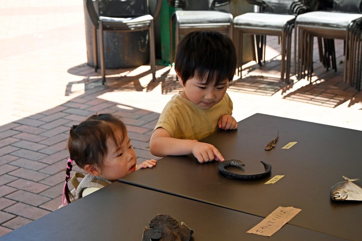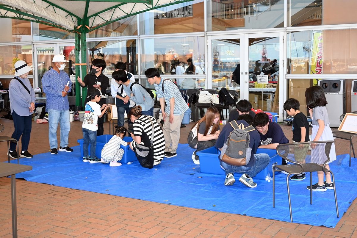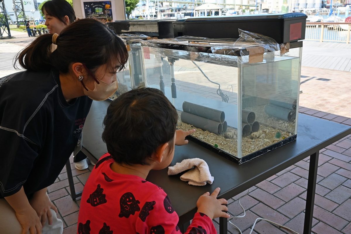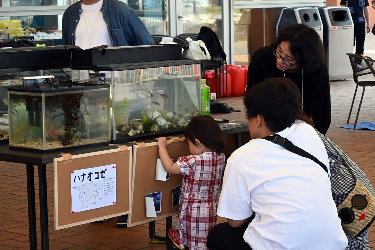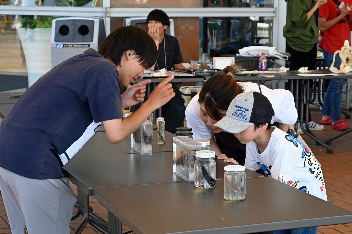学生たちは開催に向けて3月から準備を開始。静岡キャンパスや清水港、ドリームプラザとそれぞれの周辺で生き物を採集し、挿絵や写真、コラムといった展示内容の解説も作成してきました。当日は、約30名の学生がハナビラウオの幼魚やハナオコゼなど、約30種類の生き物を観察できる水槽を設営し、製作した標本を展示したほか、ウニやヤドカリなどに触れられる「タッチプール」も運営しました。来場者は、「このイベントをお目当てにドリームプラザに来ました。展示のクオリティーも高く、見ていて面白かった」「いろんな魚に触れて楽しかった」と話していました。