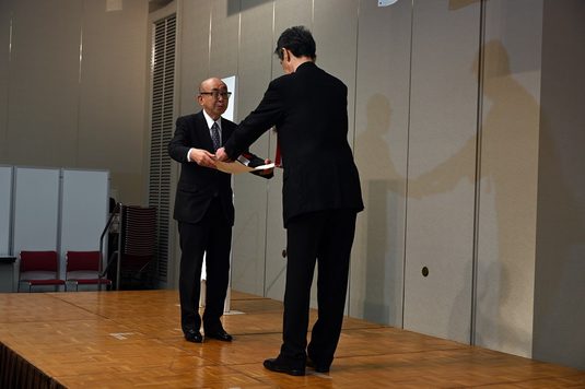 表彰式で、日本河川協会の甲村謙友会長から表彰状を受け取った田中名誉教授は、「地球温暖化により大規模な河川の氾濫などが数多く見られるようになった現代において、人々の命や財産を守るために細々と地道な研究を続けてきました。このような賞をいただけるとは考えたこともなく、受賞の連絡を受けたときには驚きと感謝の思いでいっぱいになりました」と喜びを語ります。「東海大学では、多くの学生、教職員の皆さんとともに研究に励み、学び続けてきました。若い研究者の皆さんには、コツコツと努力を積み重ねてほしい。自分の研究に打ち込み続ければ、社会の役に立つだけでなく、知らないうちに誰かが評価してくれて、自分の積み上げてきた実績に誇りを持てる日が来るはずです」と笑顔で話していました。