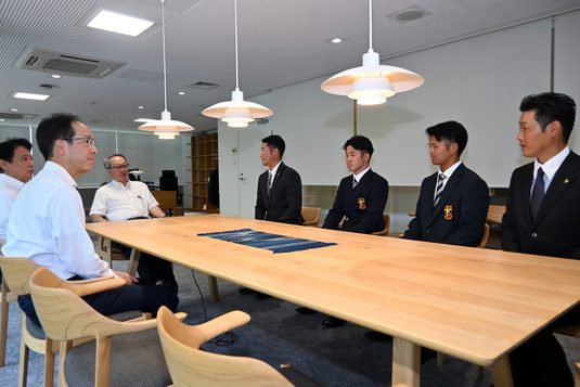 当日は、林田倫彦監督(本学職員)と徳永一毅コーチ(同)、吉村大輝主将(経営学部4年次生)、投手キャプテンの杉谷寿冴選手(同)が出席。松前理事長と梶井龍太郎学長代理、佐藤理裕学長補佐に全日本出場を報告しました。林田監督が、「選手たちの頑張りで7年ぶりの全日本出場を決めることができました。初戦では中部学院大学と対戦します」と語り、吉村主将は、「僕たちはコロナの影響で春夏の甲子園が中止になった世代です。その悔しさを全国で晴らしたい。南部九州の代表として、明るく元気にグラウンドを駆け回ります」とコメント。杉谷選手は、「阿蘇中央高校出身なので、阿蘇魂を見せて戦いたい。個人的には3者連続三振を奪ってチームに流れを持ってきて、攻撃につなげていく」と意気込みを語りました。松前理事長は、「初戦の中部学院大は強豪ですが、互いに力を出し切ったときに大事になってくるのは気持ちです。普段通りのプレーをしても、ミスをするときはあります。日々の練習から意思疎通を図り、ミスもカバーし合うとともに、監督やコーチが選手たちのプレーしやすい環境を整え、選手はそれに応えて明るくプレーしてください」とエールを送りました。
