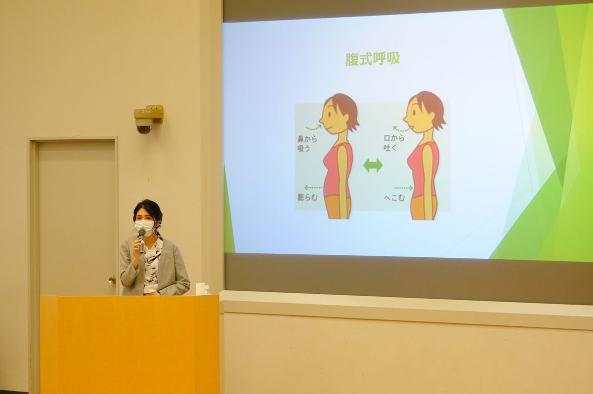 当日は、初めにFD委員の武藤望生准教授(生物学部海洋生物科学科)が研修の意義について説明した後、堰八アナウンサーが登壇。アナウンサーの仕事についての紹介に続いて、腹式呼吸を用いた発声方法や、聞き取りやすい話し方をするために母音の発声が重要である点などを説明。「マスクを着けて放送に臨むのはわずらわしさがありますが、アナウンサーは普段から『通る声』『響く声』を出すよう普段から心掛けているのでしゃべりづらいことはありません。喉の筋トレ、肺の機能を高めるトレーニングが重要であり、毎日の発声練習で鍛えています」と語りました。また、「アイウエオ、イウエオア、ウエオアイ……」と実際にアナウンサーが取り組む発生練習も披露しながら、長音の出し方や口の開き方、話す間合いやテンポ、短いセンテンスへの意識などを解説しました。また、「話の内容をより相手に伝えるためには、どのような場所で、誰に向けて、何人を相手に話しているのか空間を把握することが重要。その場所やマイクの有無によって声の扱い方は変わりますが、腹式呼吸による声の出し方は基本的には同じです。母音を大切にすることを忘れないでください」と呼びかけました。