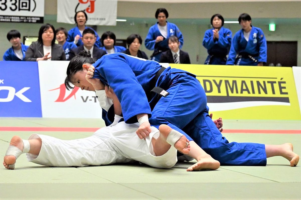 大会初日の2回戦から登場した女子は、国際武道大学を2―0で下すなど順調に勝ち上がり、準決勝では明治国際医療大学を2―0で勝利して環太平洋大学との決勝へと駒を進めました。先鋒戦から互いに一歩も譲らず大将戦まで引き分け、0-0のままゴールデンスコア方式の代表選へともつれ込むと、横田ひかり選手(体育学部2年次生)が1分10秒に谷落としで一本勝ち。歓喜の輪が広がりました。塚田真希監督(スポーツプロモーションセンター准教授)は、「団体戦メンバーの中には教育実習がある4年生もいました。大会前に調子を上げられない状況を見越し、チーム全体で準備してこられた成果」とコメント。横田選手は、「チームの目標だった“一人ずつ後ろにつなげて最後に勝つ”柔道ができた。勝利の瞬間は本当にうれしかった」と語りました。