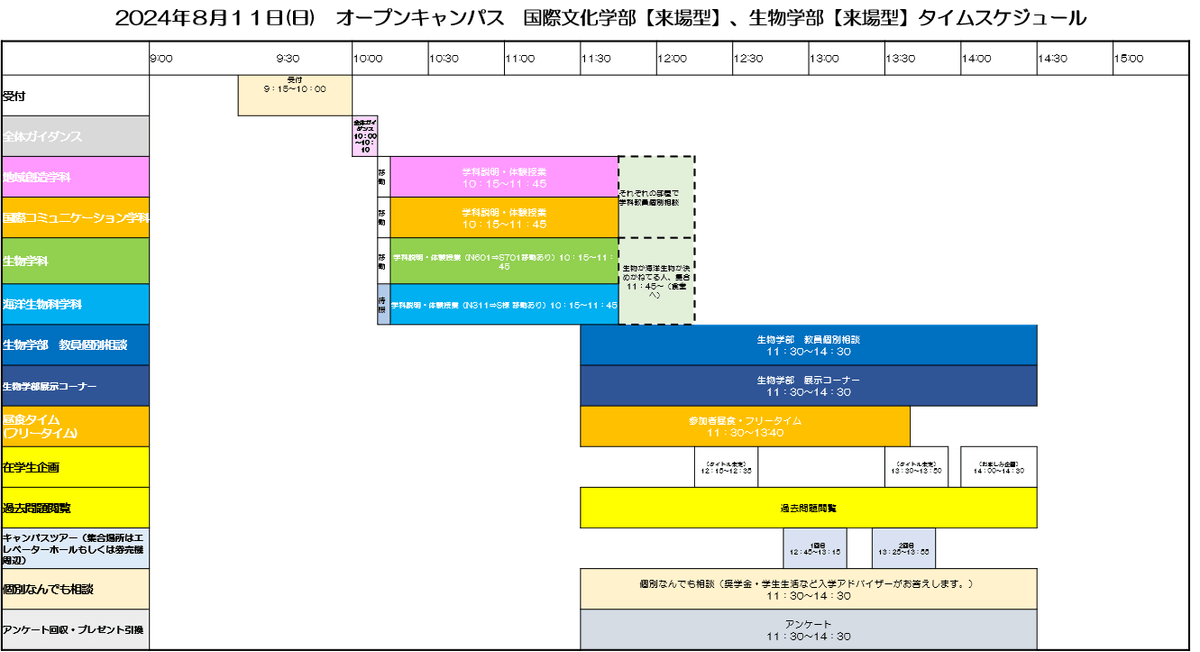 8月11日(日)は国際文化学部(地域創造学科、国際コミュニケーション学科)、生物学部(生物学科、海洋生物科学科)ともに、来場型で実施します!