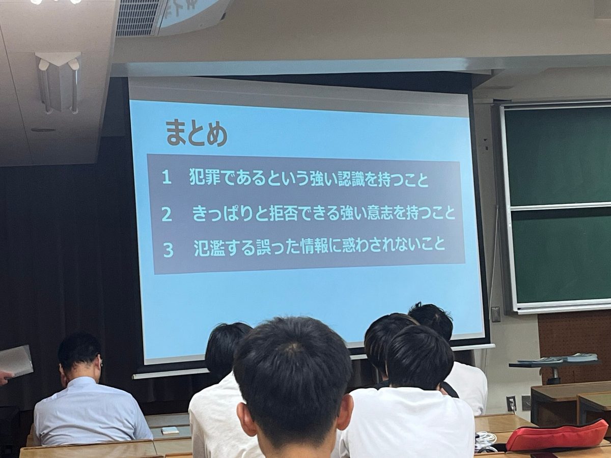 松村氏は、2023年度の薬物事犯の年代別検挙者数では、若者世代が多くの割合を占めていることを紹介。20代の大麻乱用者が初めて使用したきっかけについて、多くが「誘われて」使用したことを話し、好奇心や興味本位、その場の雰囲気で大麻を使用してしまっている状況を説明しました。続いて、薬物依存による悪循環や薬物が脳に及ぼす影響などから薬物の危険性を説明。「犯罪であるという強い認識を持つこと」、「きっぱりと拒否できる強い意志を持つこと」、「氾濫する誤った情報に惑わされないこと」の3点を強調して語りかけました。 参加した学生は、「薬物の危険性を再確認することができました。今後も危機感を持って生活していきたいと思います」、「知らないことが多くとても有意義な時間を過ごせてよかったと思った」と語りました。